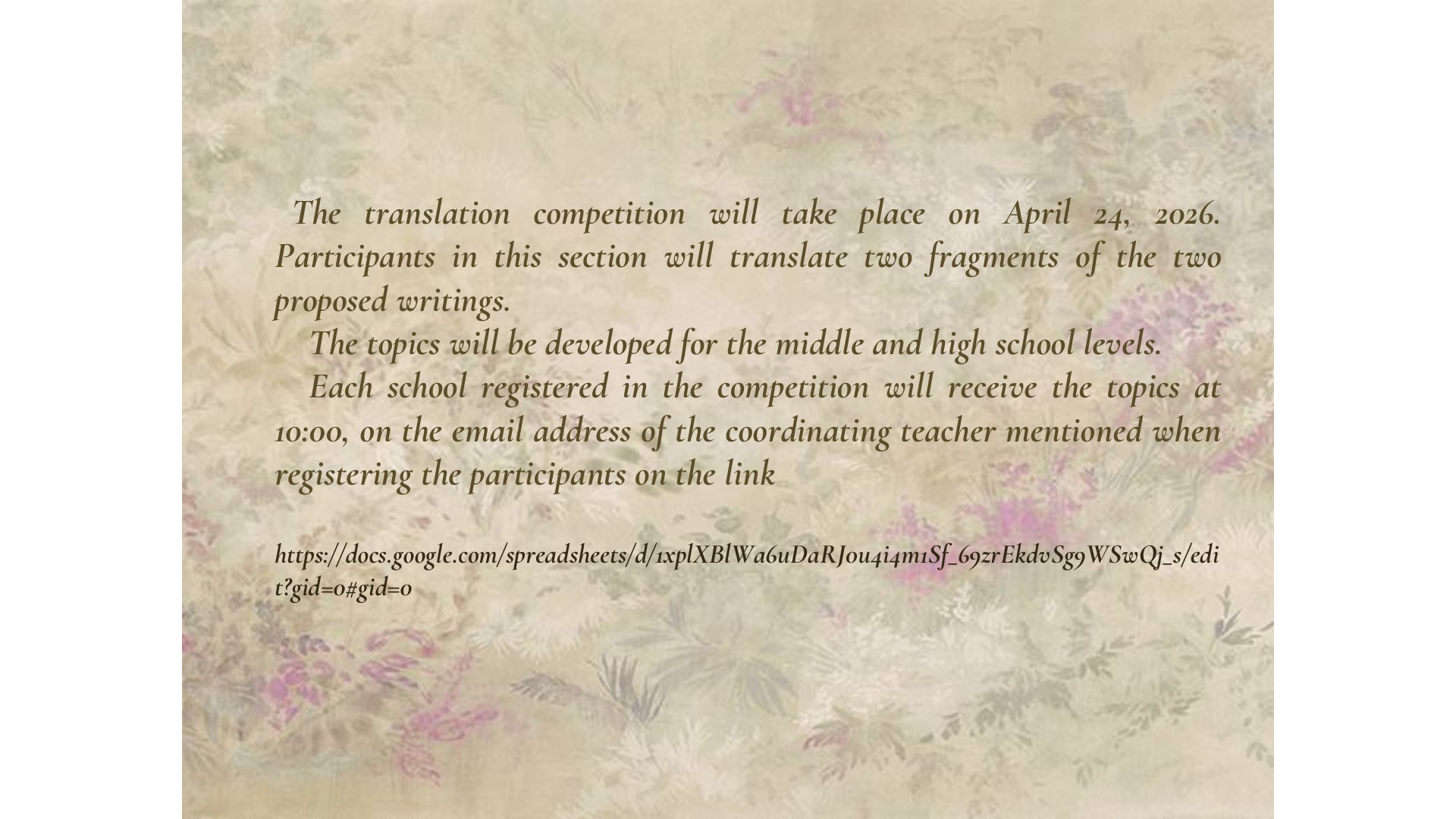 Concursul de traduceri are loc în data de 24 aprilie 2026. Participanţii la aceasta secţiune vor traduce două fragmente, din cele două romane propuse. Subiectele vor fi elaborate pentru ciclul gimnazial și cel liceal. Fiecare liceu înscris în concurs va primi subiectele la ora 10.00, pe adresa de e-mail a profesorului coordonator menționată la înscrierea participanților pe (Link de inscriere)