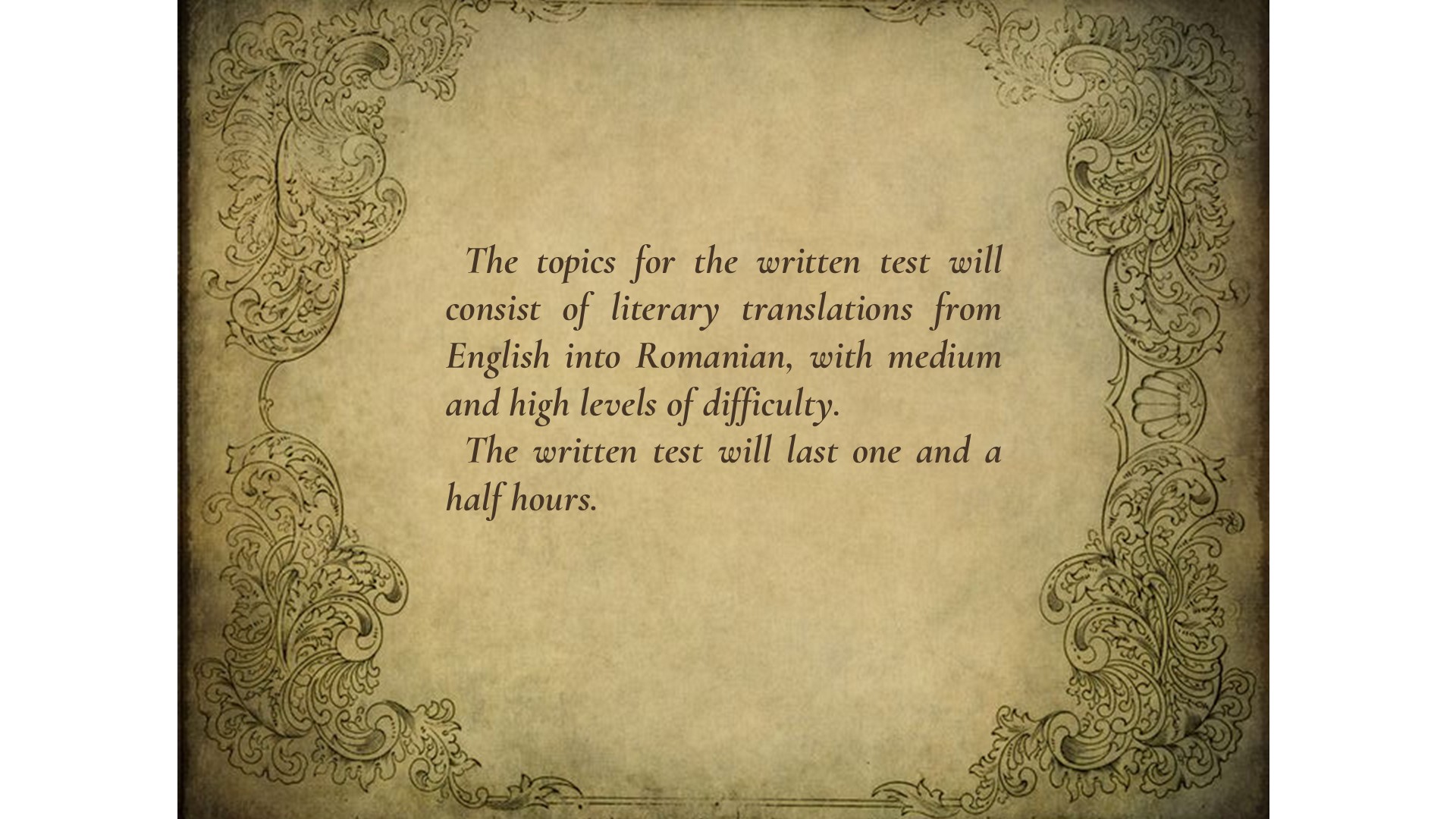 Subiectele de la proba scrisă vor consta în traduceri literare din limba engleză în limba română, cu nivel mediu şi sporit de dificultate. Proba scrisă va avea durata de o oră şi jumătate.